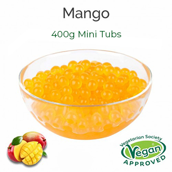 Mango Popping Pearls, also known as Bursting Boba, are juicy balls of Mango flavor that pops in your mouth when consumed. The outer layer of the popping boba is made from seaweed extract, which makes this topping caffeine-free and vegetarian style. Adding these popping pearls as a special garnish to your beverage or dessert will definitely make them look more visually appealing to your customers.